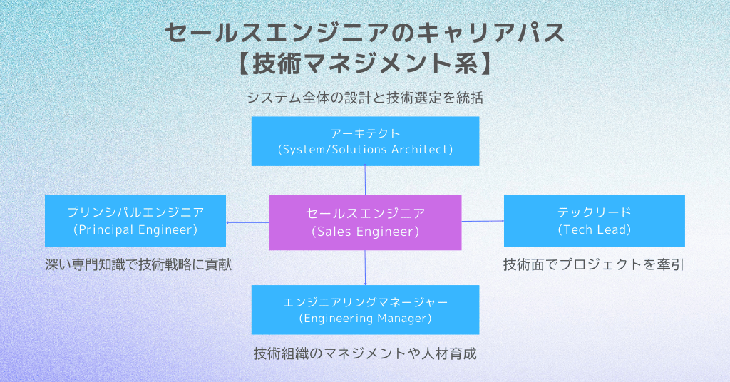 セールスエンジニア出身者は、PdMやプリセールス、BizDevといったビジネス職、あるいはテックリード・EM(エンジニアリングマネージャー)といった技術系マネジメント職へと進む人が多くいます。