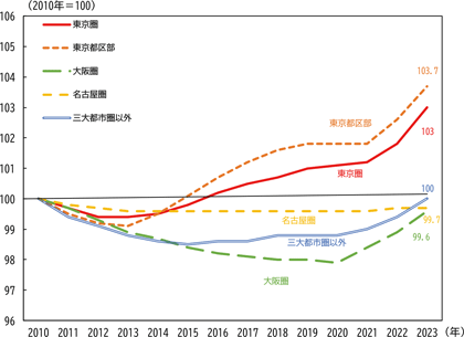 引用:地域課題分析レポート(2024年春号)図表3-13 都市圏別にみた共同住宅賃料指数